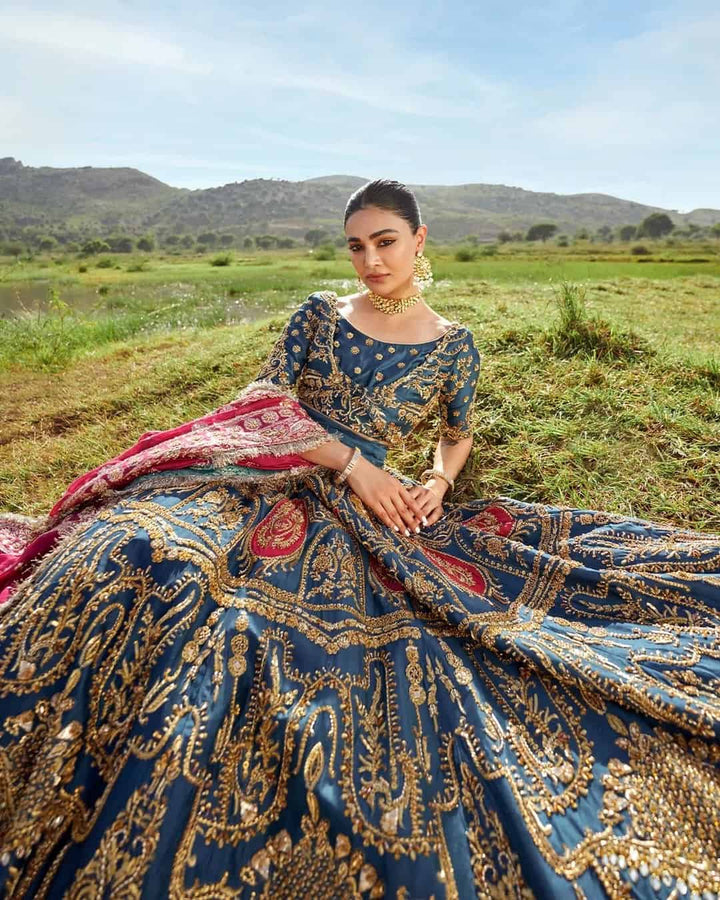 - Rich admiral blue raw silk lehenga with fuchsia and yellow accents.