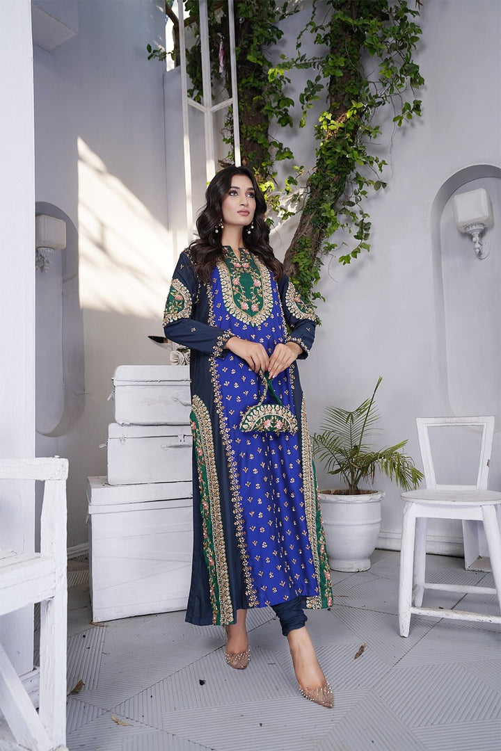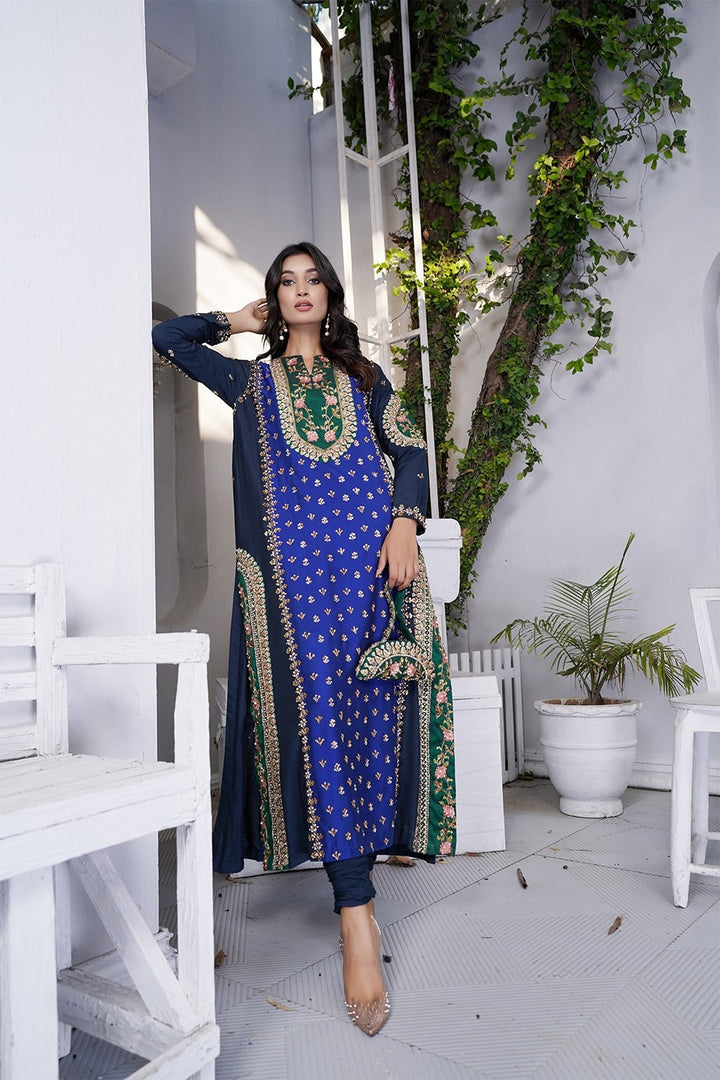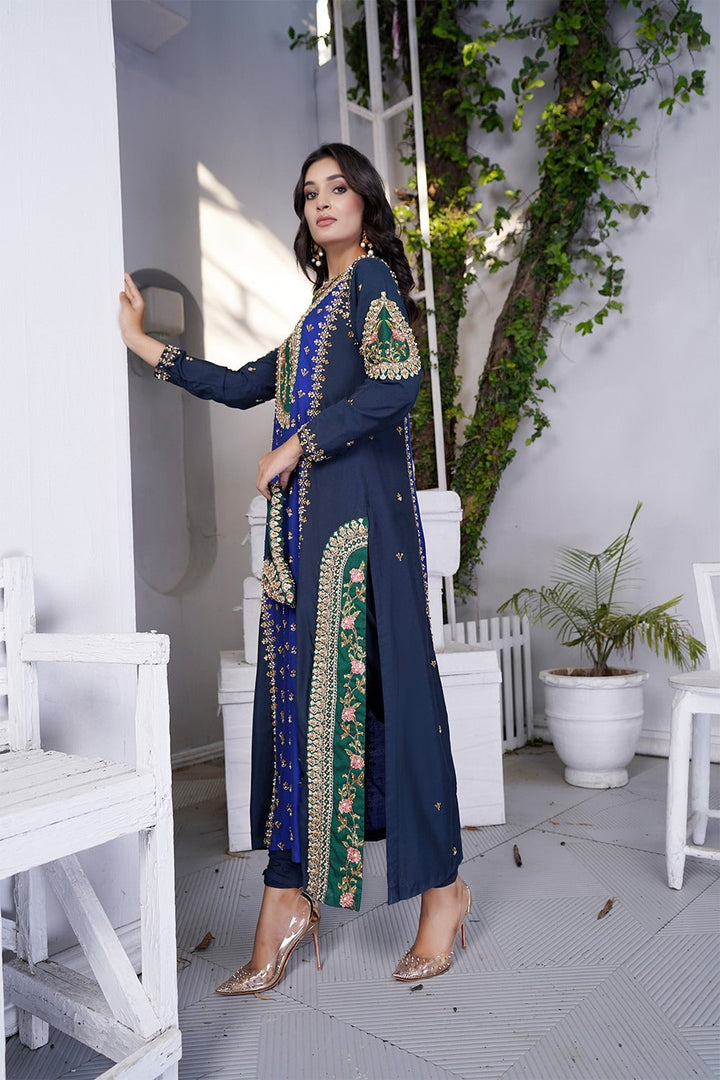 A long shirt of floral fusion is embossed with zardozi, crystals, tilla, pearls and thread work, the color blocking of this elegant silhouette makes it a piece of art. It is paired with a churridar lower.
