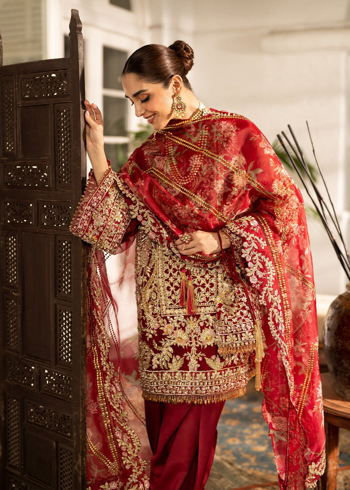 step into royalty with Crimson Royal, a breathtaking Pakistani bridal dress designed for those who seek luxury wedding wear with intricate embroidery and traditional craftsmanship. This designer sharara outfit is a perfect blend of culture and modern elegance, making it ideal for weddings, receptions, and grand celebrations.