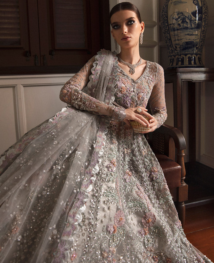 'Azilis is wrapped in the elegance of ice blue, this traditional paneled frock is reimagined with a contemporary touch, featuring an overlapping bodice that cinches like a cross-body belt. The wider V-curved neckline, detailed with delicate lace, complements the long, fitted sleeves edged with lappa. Azilis’s grace lies in the wide satin hem border, cascading into layers of scallops, while the paneled lehenga whispers tales of timeless craftsmanship. The net dupatta, framed with a four-sided cutwork border and lappa scallops, carries an embroidered pallu, balancing the outfit with its heavy, yet harmonious detailing.