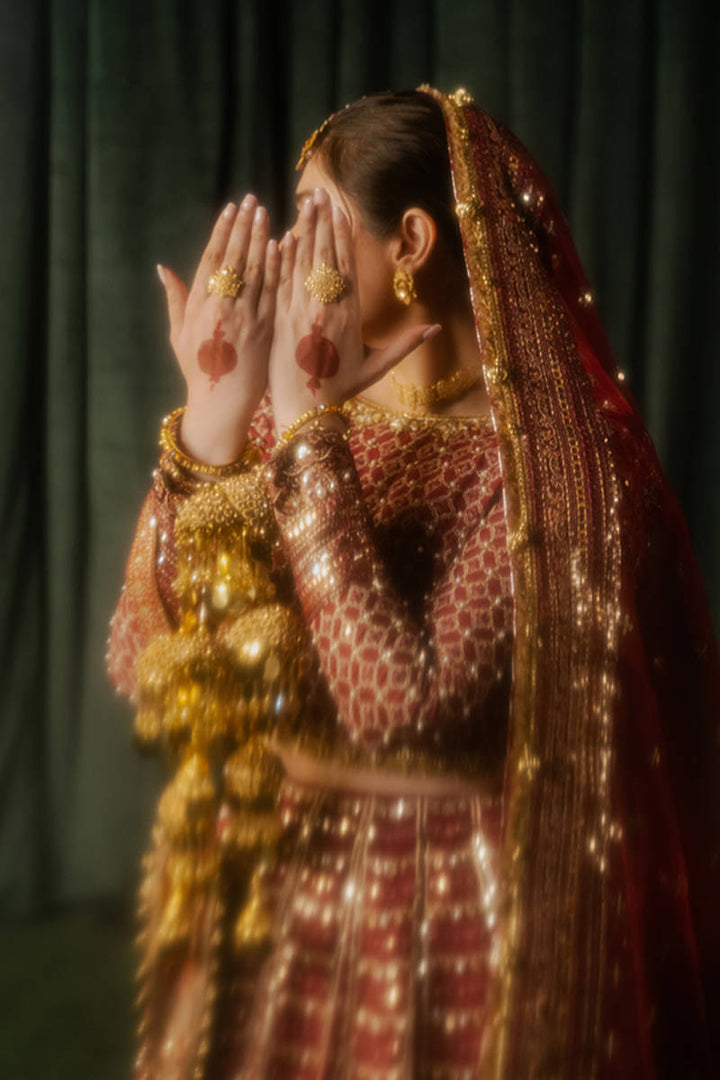 Step into the allure of tradition with "Bia" from MNR’s Dur-e-Nayab 2024 collection. This maroon lehenga choli, crafted from luxurious Indian silk, radiates opulence with its geometric motifs and a neckline delicately embellished with pearls, gota patti, and sequins. Velvet patches on the lehenga lend richness and depth, while a soft organza dupatta, framed with a four-sided sequin border, adds the perfect touch of grace.
