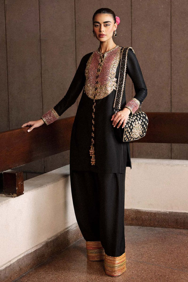 An absolute elegant black raw silk shirt with a heavily embellished neckline with tassels adding to the detail and beauty to this fit. Its paired with shalwar with colorful gota border and a beautiful printed organza dupatta filled with sequin spray.