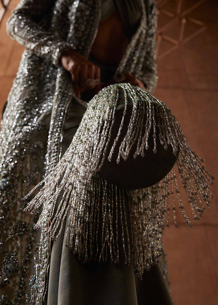 A classic dusty green organza jacket crafted with exceptionally intricate embellishment of handwork on sleeves and in panels.