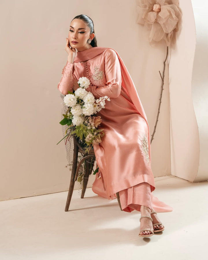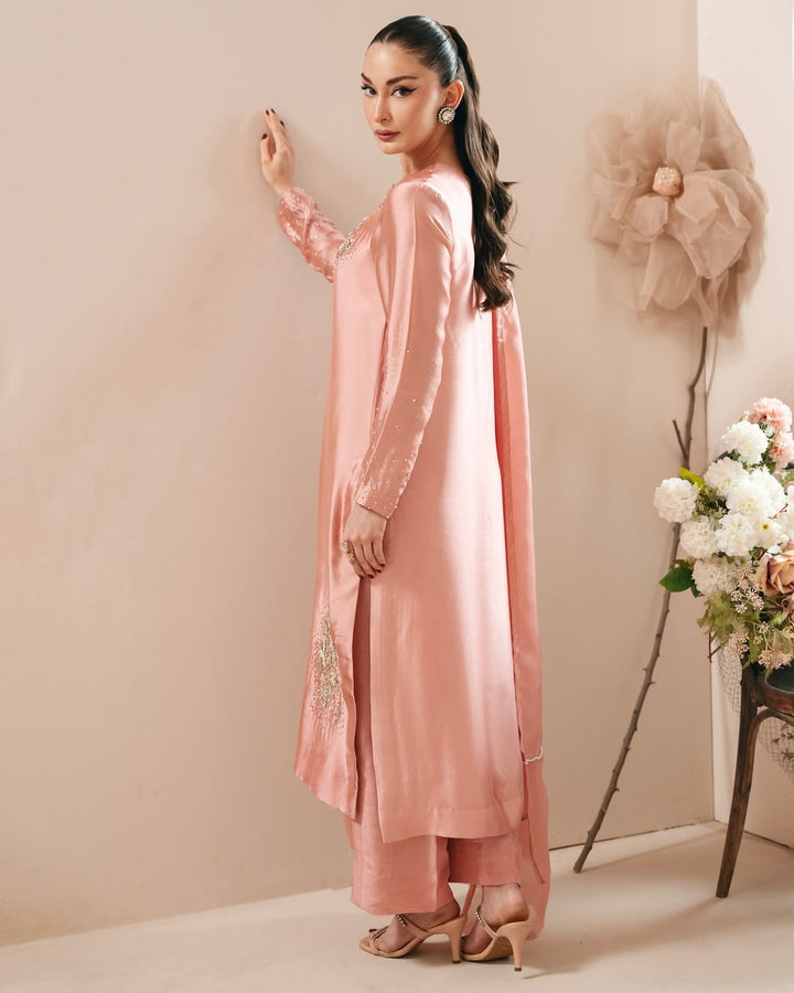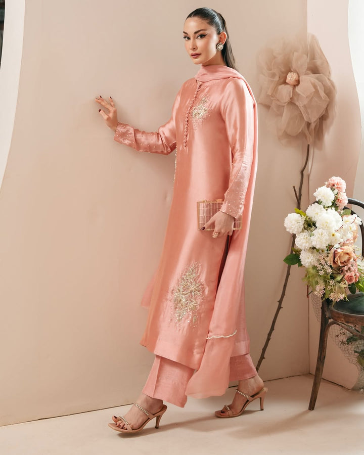 This elegant long shirt is beautifully adorned with a scattered spray of pearls and crystals, along with tilla and threadwork in intricate motifs. It’s paired with straight pants and a medium organza dupatta, featuring organza edges with a delicate spray for an added touch of beauty.