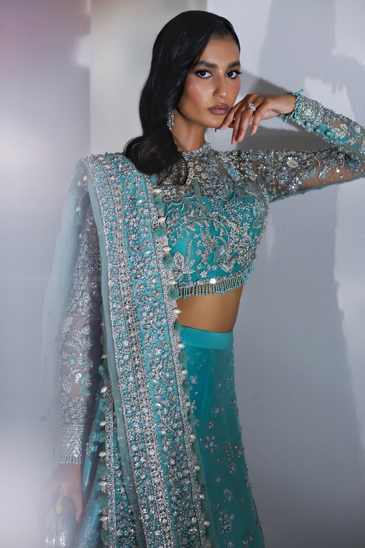 Ethereal and breathtaking, Élan luxury pret enchants with its mesmerizing romantic allure and celestial charm. The 'Étincelle de cristal' ensemble showcases luxurious fabrics in ethereal, dreamy hues, adorned meticulously with intricate hand embellishments, luminous pearls, and dazzling Swarovski crystals, all enhanced by Quintessential Élan tassel details.