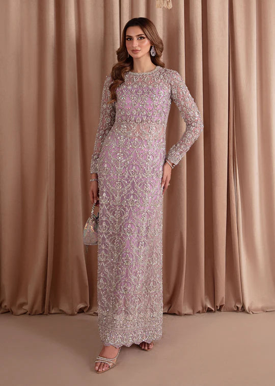 Step into the spotlight in our mesmerizing lilac long dress, adorned with magnificent silver embellishments that promise to dazzle and enthrall. Meticulously crafted from luxurious organza fabric, this ensemble seamlessly blends timeless charm with modern allure. The dress cascades gracefully, enveloping you in a regal aura that commands attention, while its form-fitting bodice accentuates your curves. Delicate embroidery, shimmering sequins, and elaborate embellishments add opulence and sparkle, elevating your style to new heights. Completing this show-stopping look are cigarette pants in the same captivating lilac hue, adorned with silver tissue side seams for a striking finish. Get ready to captivate hearts and steal the spotlight with this exquisite ensemble.