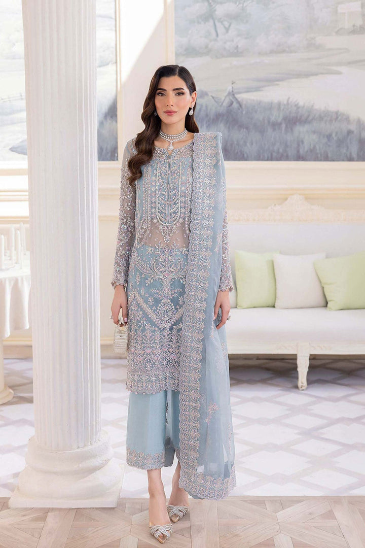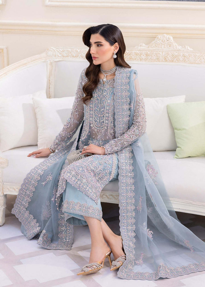 The ice blue mid-length shirt is a vision of elegance, exuding sophistication with its delicate embroidery and shimmering silver embellishments. The intricate patterns and motifs dance across the design, creating a mesmerizing tapestry of beauty that catches the light with every movement. This shirt embodies timeless charm and refined grace, making it the perfect choice for any special occasion. This shirt is paired with the culottes pants, which add a modern flair to the ensemble. The normal bottom silhouette offers both comfort and style, while the tailored fit ensures a flattering look. The pants perfectly balance the feminine elegance of the shirt, creating a harmonious and chic outfit that is both sophisticated and contemporary .Completing the ensemble is with the embroidered dupatta, the dupatta ties the outfit together seamlessly.