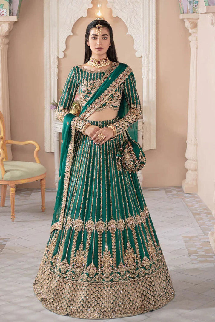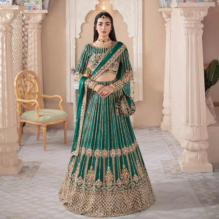 The magic of linear design with engaging embellishments on a forest green hue is what makes Fariza an eye-catching outfit. The timeless silhouette is crafted on Korean silk, with floral and lined motifs. Lavishly adorned lehnga is flawlessly hand worked giving it a sublime look. The elaborately detailed border and sequin spray on the organza dupatta makes the ensemble ideal for any festive event.