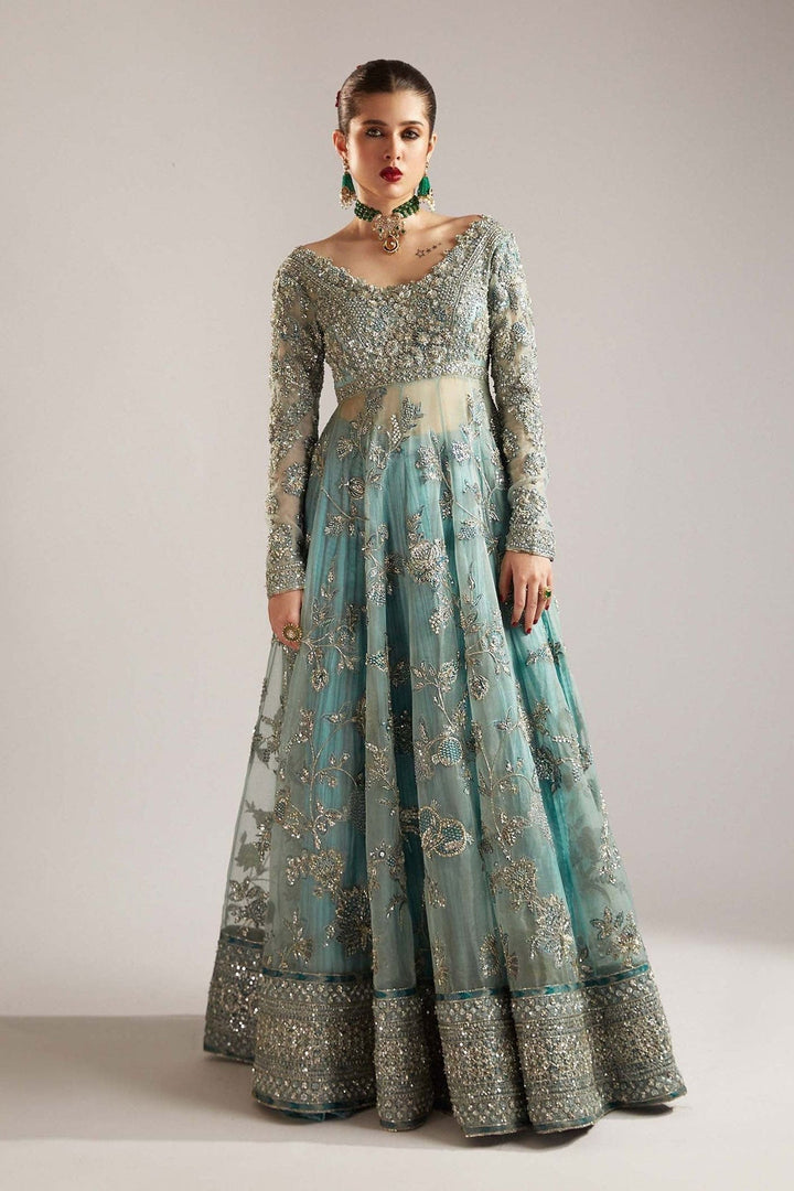 A dainty Ice-Blue silhouette, lavishly adorned with intricate embellishments on the front and back bodice, creates an alluring look. The opulent peshwas showcase heavy embellished borders, evoking a regal charm fit for royalty and master pc of designer . Completing this enchanting ensemble is the digital printed dupatta, featuring celestial motifs in mesmerizing hues. Its four sided embellished border exudes an aura of ethereal elegance.