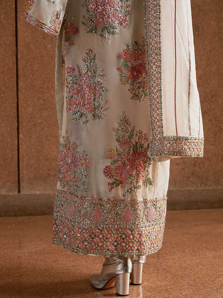 A perfect illustration of dazzling hues features stunning Ivory organza shirt with floral bunches embellished with intricate handwork details of sequins, resham, nakshi and dabka along with korean rawsilk choridar. Paired with a detailed embroidered organza duppata enhanced with intricate handwork details on four side border, setting a timeless appeal.