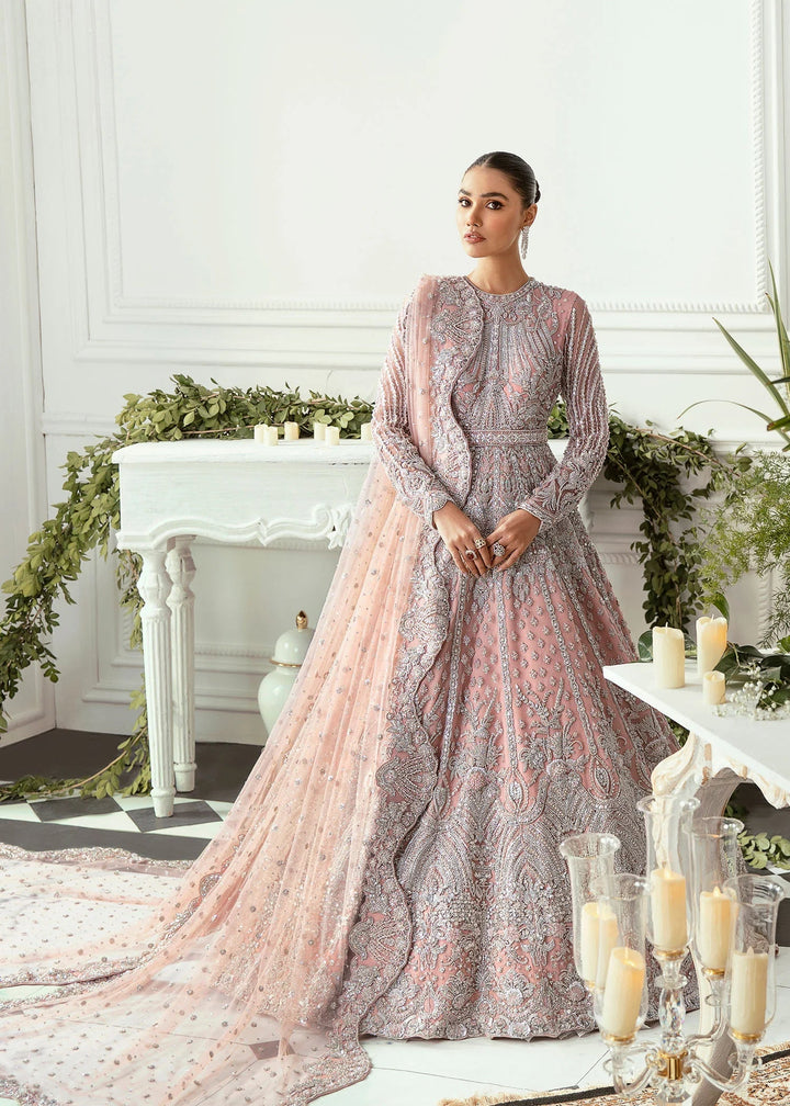 Designer Embroidered Blush Pink Indian Outfit is embellished with dabka and hand-embellished thread work. This traditional bridal maxi is best for your wedding event. This pretty long frock has a glamorous outlook and embellished work of silver stones that is the perfect combination for your big day. Buy this maxi online for your beautiful day to make it more memorable.