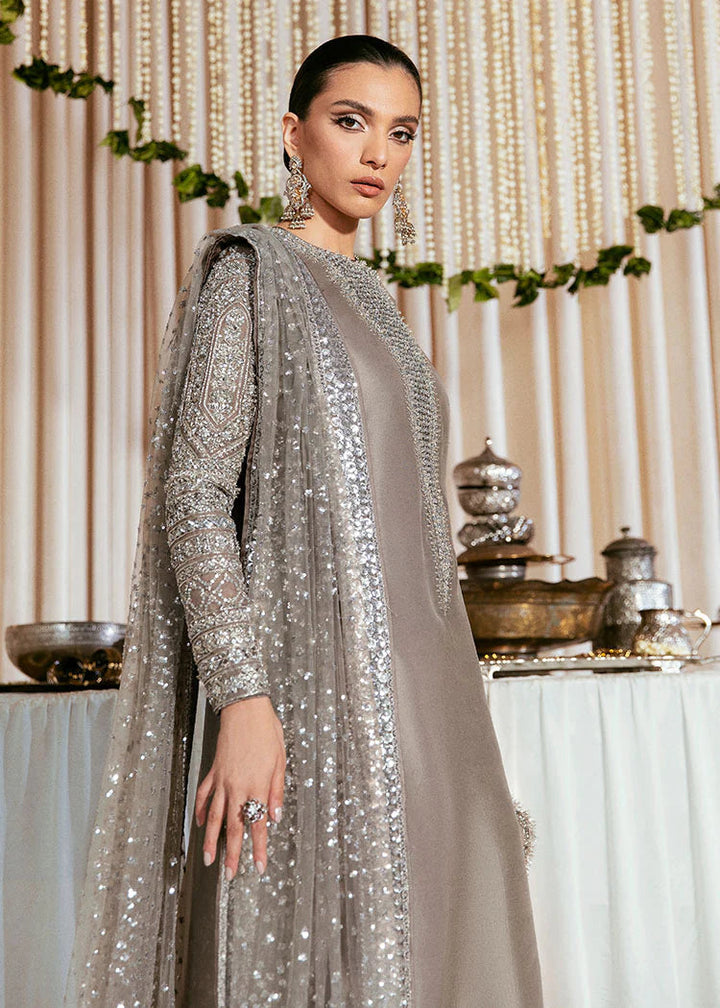 It’s a graceful grey raw silk shirt with heavily embellished front and organza sleeves. The dainty embellishments are in silver and grey pipes, sitara, cutdana, nakshi, dabka and Swarovski. It comes with a Indian Raw silk chooridaar and a gorgeous dupatta with sequin border on all 4 sides and heavy chatta of silver sitara.