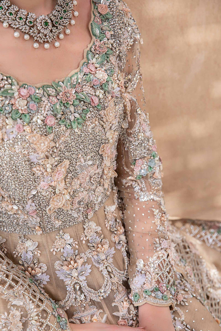 LUNARA' is our contemporary classic Gown Set crafted to perfection in nude peach organza. It achieves a glistening dewy look with an exquisite composition of embroidery motifs adorned with intricate details of ribbon, diamantes, sequins, pearls, crystals, dabka & naqshi work so you can radiate joy & confidence. Pakistani indian wedding bridal dress, mehndi nikkah outfit guest clothes