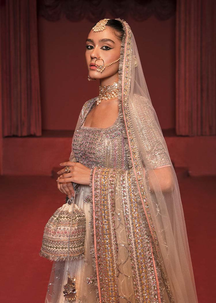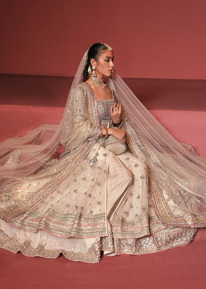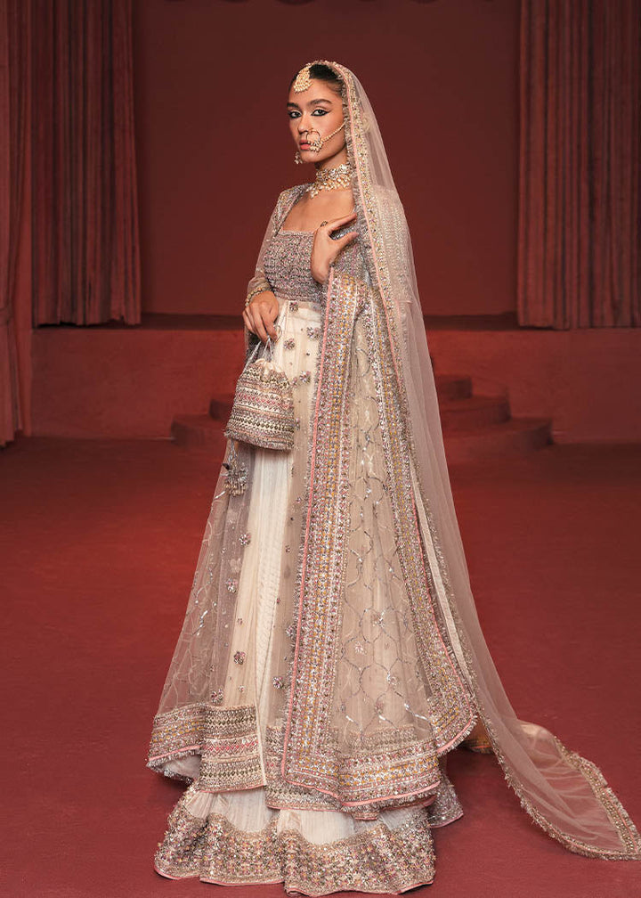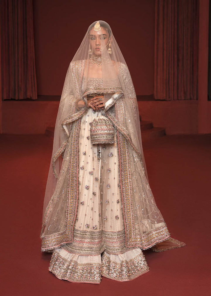 An exquisite ivory net peshwas with a body full embellished along with its sleeves with silver sequins, cutdana, Mukesh and nakshi. It’s a front open peshwas with chatta of booti made intricately made with sequins. It comes with a silk crushed sharara with embellished borders. There are two net dupattas, one with a stunning jaal of silver sequins. As well as an embroidered and embellished thick border. The second net dupatta is a plain ivory dupatta with an embellished border on all four sides.