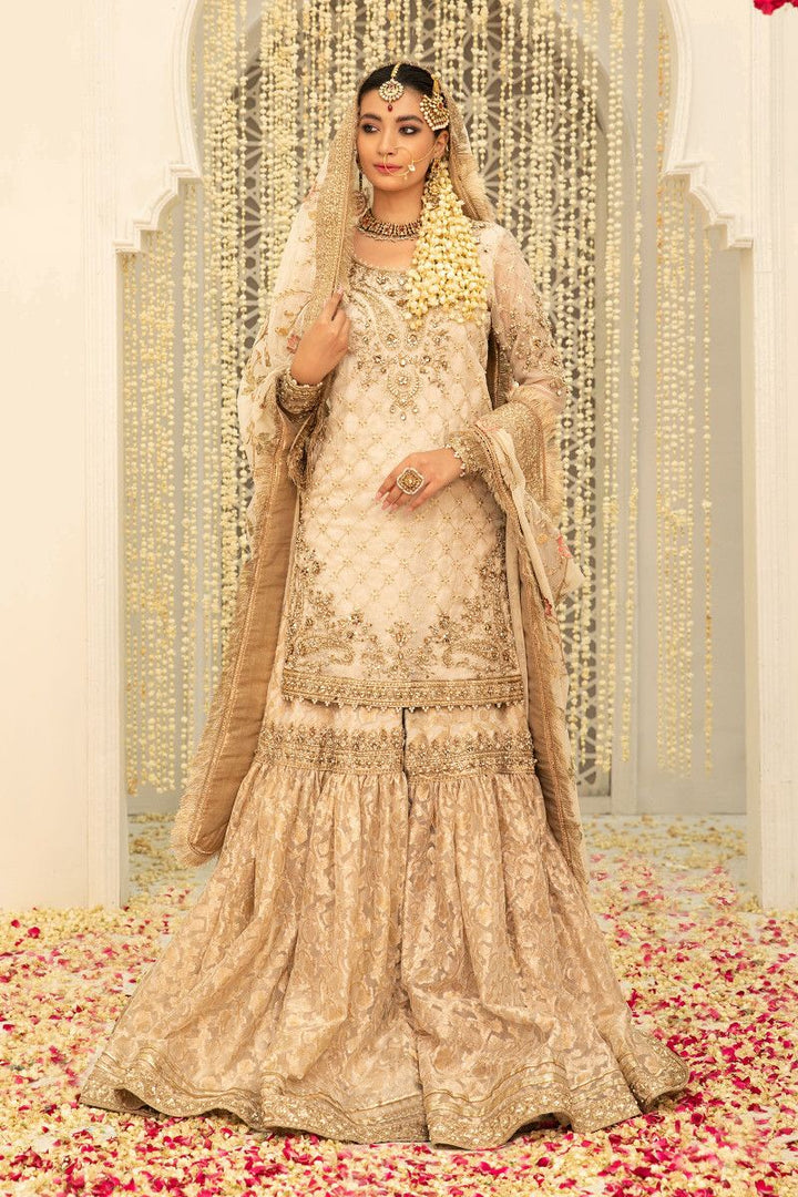 The most loved traditional Kurti Gharara delicately crafted with Kundan Zari hand work and 3D gotta work entwined with sequins, pearls, dabka, naqshi. Dupatta is composed with a floral jaal spread and hand embellished worked head border and three sides light embellished border with suchi kiran finishing all over.