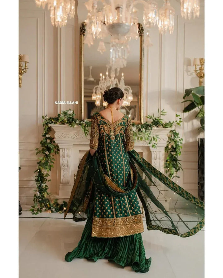 A beautiful Sacramento green hyderabadi outfit , styled with a crushed silk lehnga . Intricately handworked with marori and dapka , perfect for the festive upcoming wedding season.