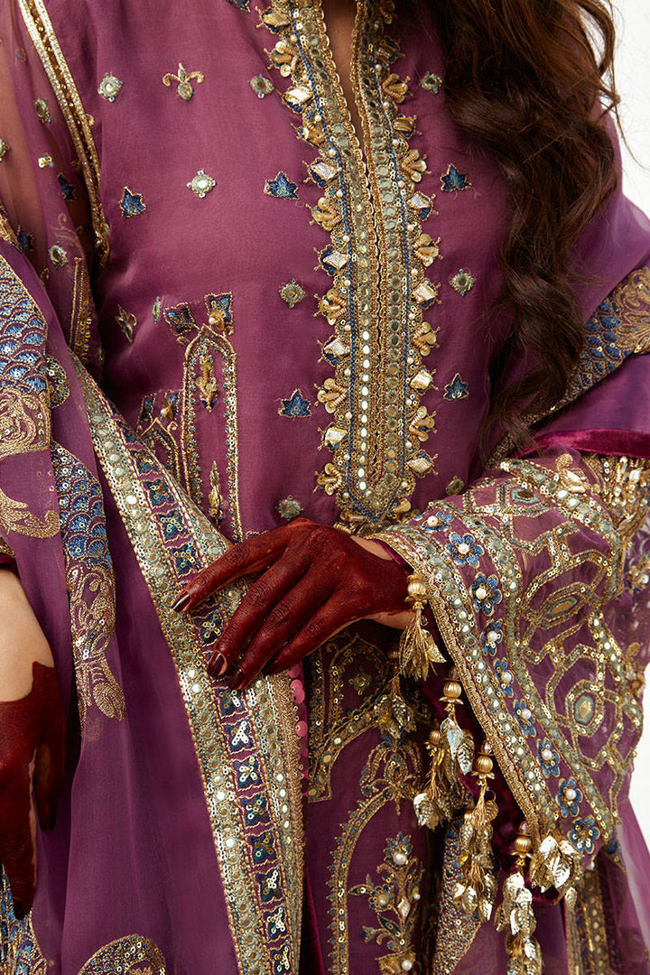 Jigri is composed over a vintage mauve base in organza. Sajal carries the delicately embroidered kameez with a composed neckline and heavy daman embroideries finished with hand embellishments. It comes with an embroidered sharara finished off with our signature borders and a tonal dupatta doused in vintage paisley pattern and framed with a delicate borders for the perfect vintage appeal.