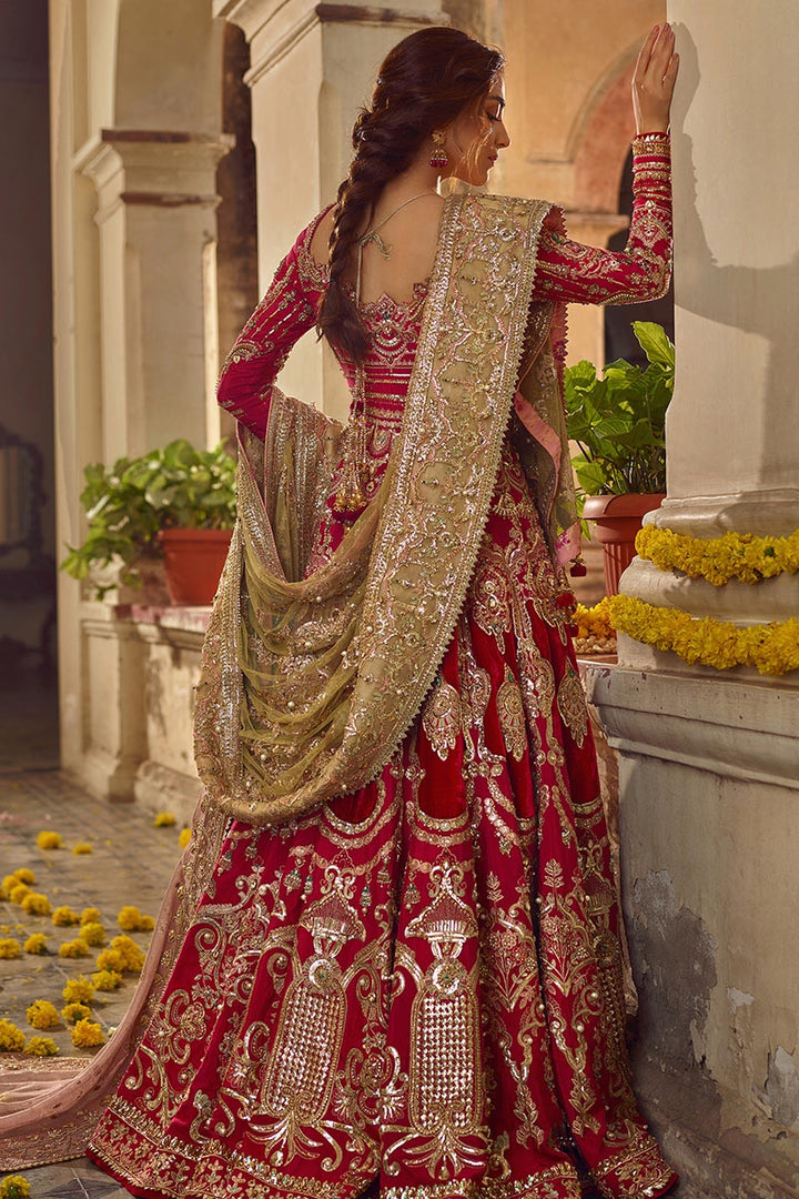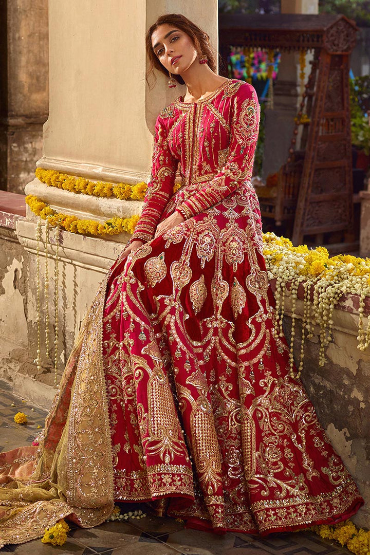 Mumtaz is a 4 piece bridal consisting of a silk pishwas with zarri tilla embroidery with a mix of delectable gold embellishments and deep fuchsia velvet appliqués matched with a stunning shocking pink brocade lehnga. It is paired with a lime green net dupatta with elaborate embroidered base with a stunning glimmer of embellished details and a powder pink cotton net chador with heavy borders of gota and marori .