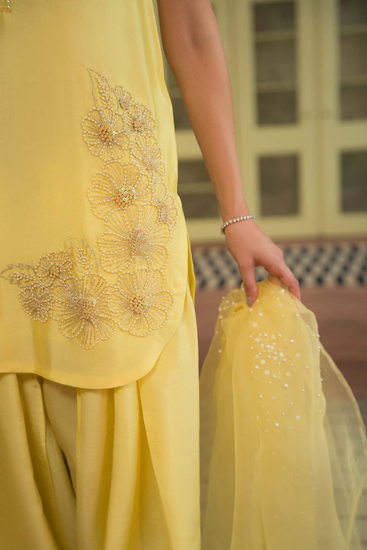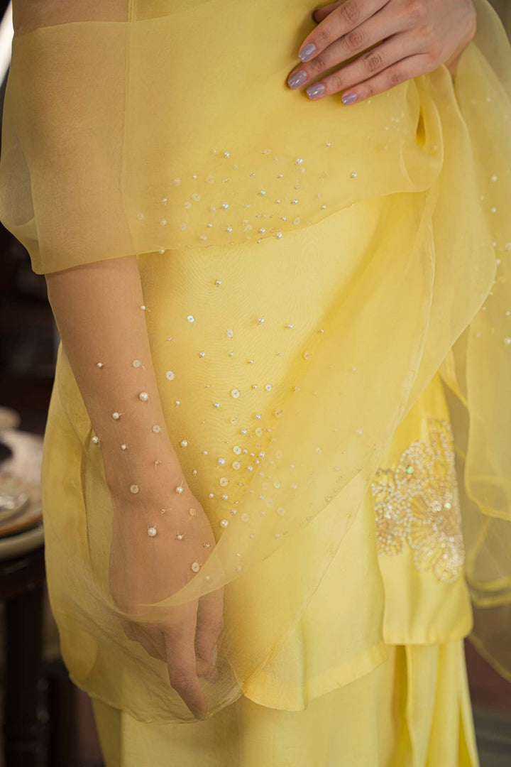 Embellishment: Purely Hand crafted embellishment of pearls, sequins, crystals and katdana on shirt motif with chunky spray on duppata.