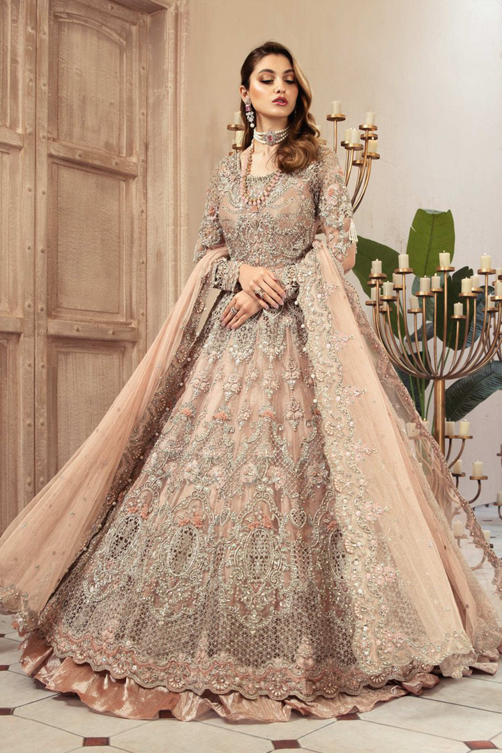 Alluring long gown glamorized with a beaded neckline, pearls, diamonites, sequence and 3D floral handwork with intricate cutwork detailing and a scalloped worked velvet border.