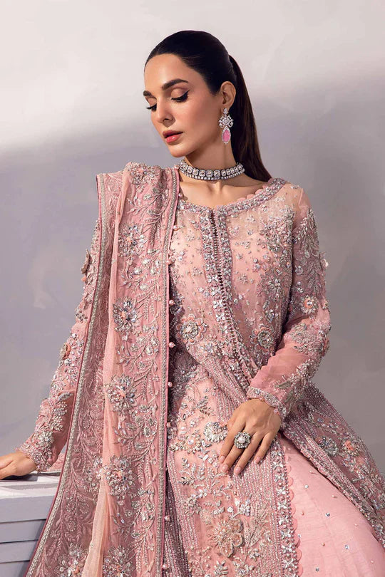 Indulge in the splendor of 'Resmin' Lehenga Set, bathed in a delicate blush pink hue. This artful craftsmanship is enveloped in timeless beauty with iridescent sequins, lustrous crystals & glistening milky pearls. The ombre lehenga & shirt stand as a divine embodiment of time-honored elegance. The exquisite 3D florets, dabka & naqshi detailing impart an air of grace & sophistication, making it a perfect choice for the occasion of Nikah, Baraat & Walima.