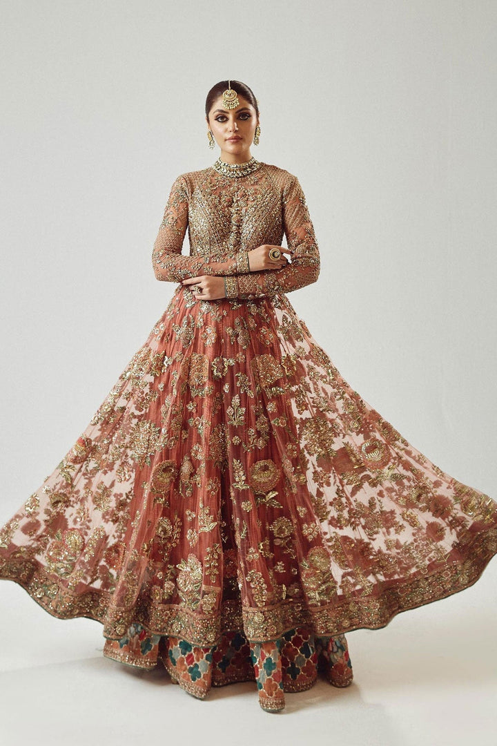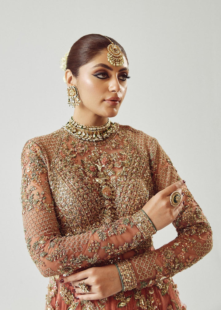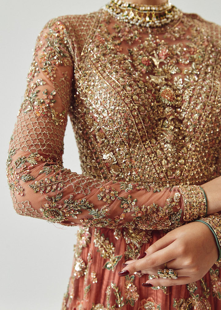 A spectacular rose gold net peshwas. The exquisite reham embroidery, enhanced with intricate adda work, elevates this ensemble to new heights of elegance. The medium silk crushed sharara, adorned with organza chatapati borders, exudes a sense of regal sophistication. And the organza dupatta, adorned with mesmerizing adda work, and organza chatapatti four sided borders adding a touch of ethereal beauty.