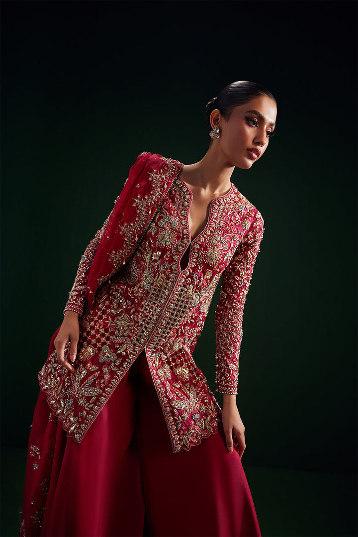 Regal is a striking crimson rose organza short jacket, featuring intricate dabka cutwork and an exquisite seesha steel-toned floral design. It is paired with a matching two tiered sensuous, flowy sharara, and completed with a beautifully embellished dupatta, creating a bold and elegant statement ensemble at any grand occasion.