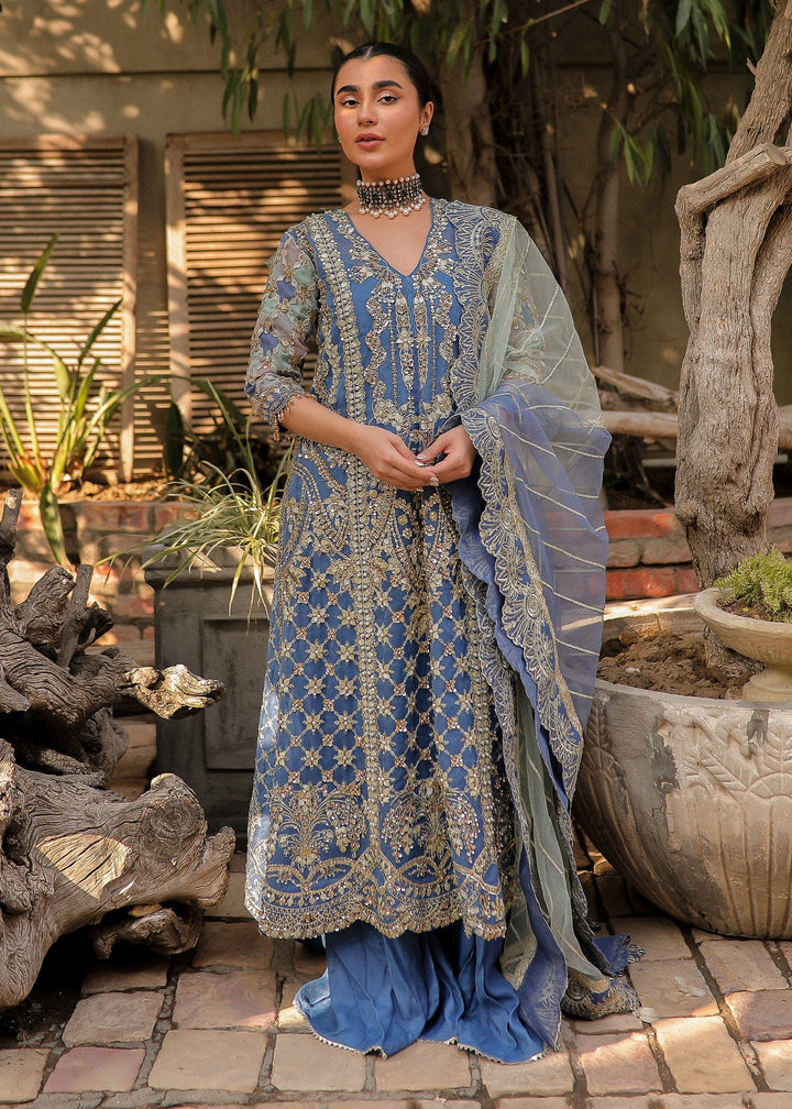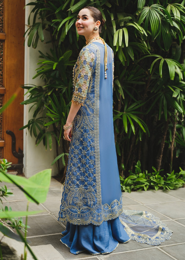 This design features an entirely handworked front encrusted in gota patti, fine pearls and crystals against classic tilla embroidery. The sleeves are beautifully handworked on chatta patti in shades of pink and mint, giving this ensemble the perfect accent. The duppatta is in two shades, blue and mint complimenting the sleeves and adding the a subtle contrast to the shirt, with delicate sequins lines giving it the perfect amount of shimmer, the duppatta is finished with the prettiest lace border in gold tilla embroidery.