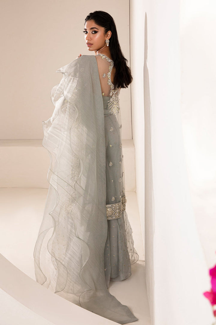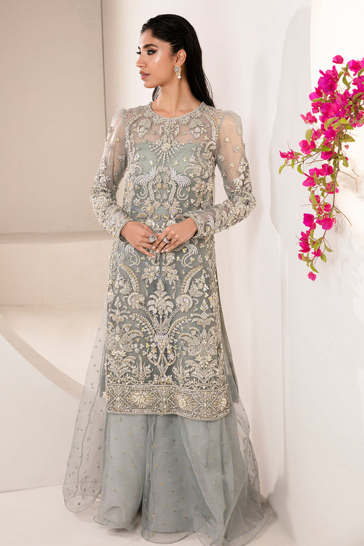 Turquoise Embroidered Pakistani Wedding Dress in Gahrara Kameez Style comes in a heavily hand-embellished net shirt creating aesthetic magic with its intricate motifs. The Swarovski crystals, pearls, and threadwork give it an eye-pleasing look.