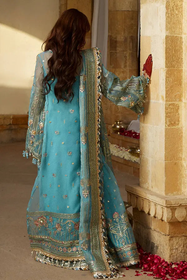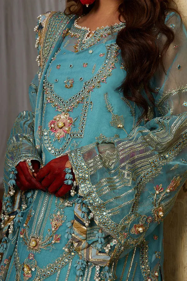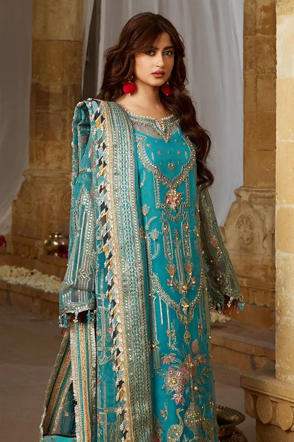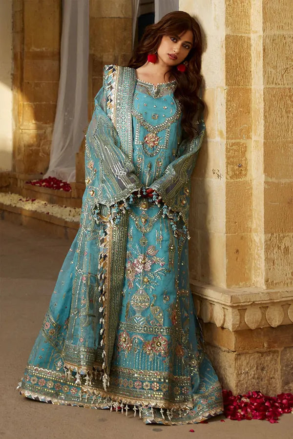 Sajal is seen wearing Umber, set on a dreamy asmaani blue organza base; The stellar outfit is doused with lush embroideries depicting classic arches, flora extracted from Mughal architectures made of fine strands of tilla, resham and accents of panni further enhanced by our signature hand embellishments. The composed shirt is matched with a generously worked lattice dupatta framed with embroidered borders and embroidered dhaka pajama finished with detailed borders.