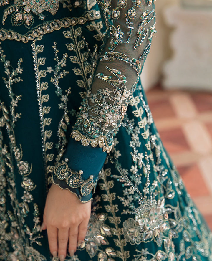 Glide your way through the festive season in mesmerising glamour clad in the meticulously crafted ‘Une Jacinthe’. A classic teal ensemble with an intricately adorned bodice with a classic V neck is clenched to a panelled shirt is fully encrusted with handwork bellishments, shimmering crytals, pearls and Swarovskis placed in stunning floral array. Worn over an embellished panelled lehanga. Paired with a teal organza foil printed dupatta with sequined scallope border; this ensemble is a statement par excellence.